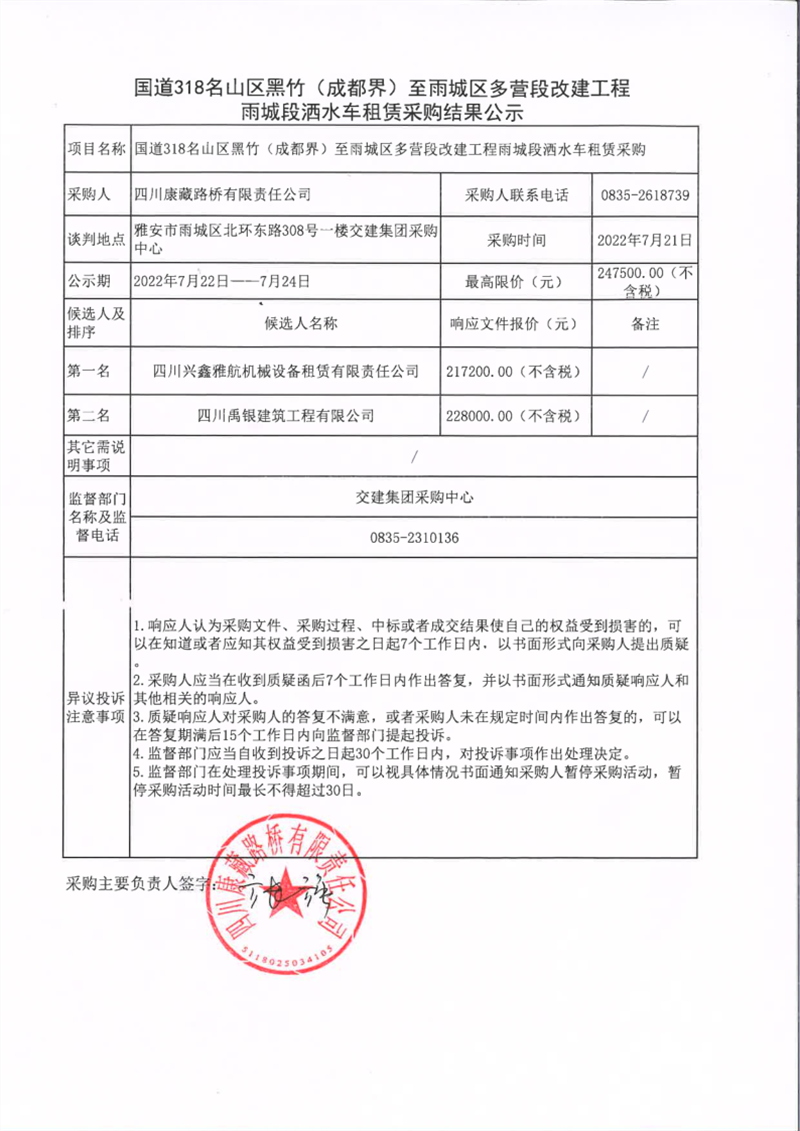 四川康藏路橋有限責(zé)任公司國(guó)道318名山區(qū)黑竹(成都界)至雨城區(qū)多營(yíng)段改建工程雨城段灑水車租賃采購(gòu)結(jié)果公示