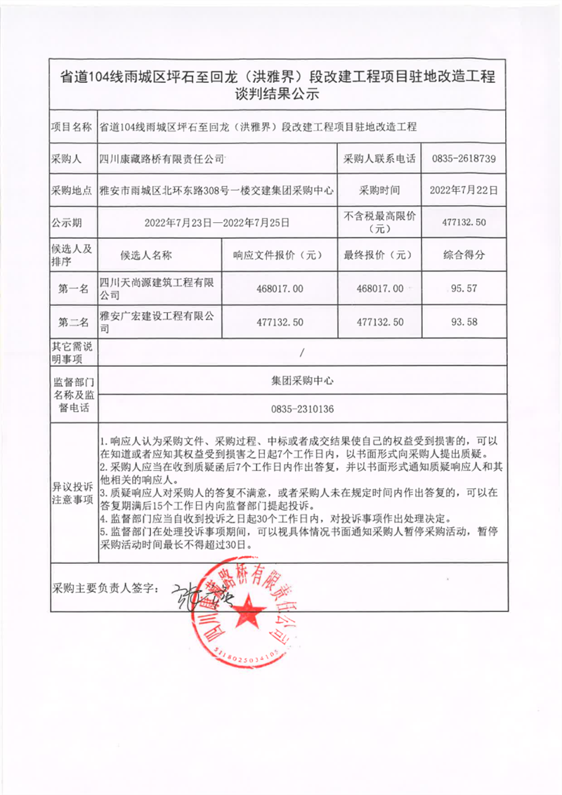 四川康藏路橋有限責任公司省道104線雨城區(qū)坪石至回龍(洪雅界)段改建工程項目駐地改造工程談判結果公示