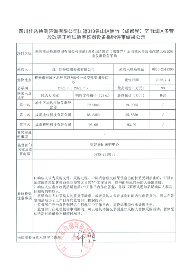 四川佳岳檢測咨詢有限公司國道318名山區(qū)黑竹(成都界)至雨城區(qū)多營段改建工程試驗室儀器設備采購評審結果公示