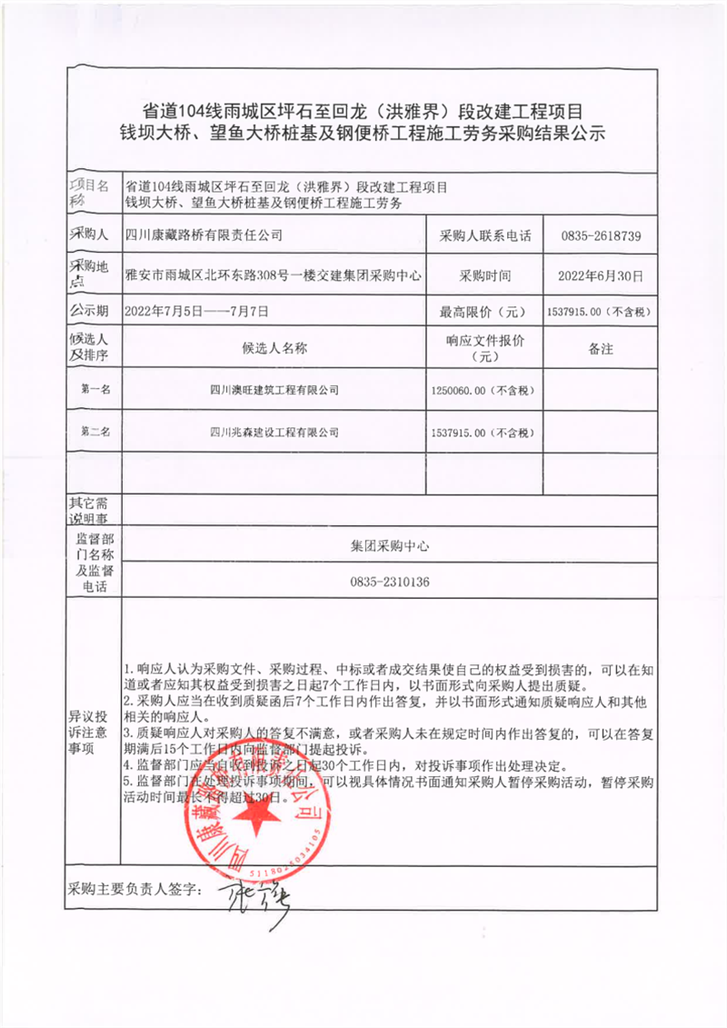 四川康藏路橋有限責(zé)任公司省道104線雨城區(qū)坪石至回龍(洪雅界)段改建工程項(xiàng)目錢壩大橋、望魚大橋樁基及鋼便橋工程施工勞務(wù)采購結(jié)果公示