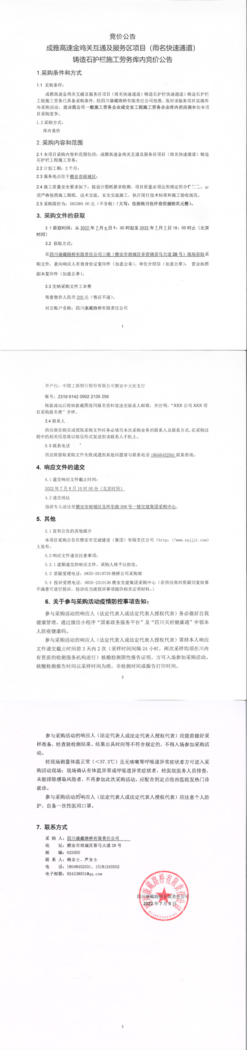 四川康藏路橋有限責任公司成雅高速金雞關互通及服務區(qū)項目(雨名快速通道)鑄造石護欄施工勞務庫內競價公告
