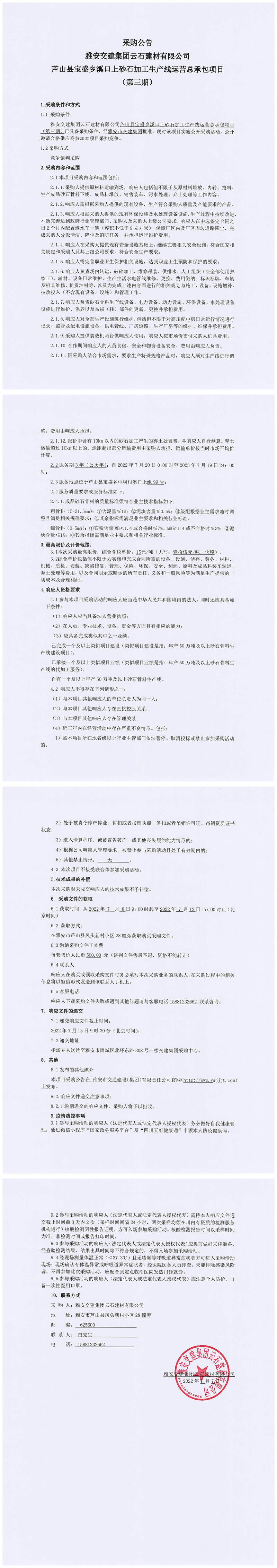 雅安交建集團(tuán)云石建材有限公司蘆山縣寶盛鄉(xiāng)溪口上砂石加工生產(chǎn)線運(yùn)營(yíng)總承包項(xiàng)目(第三期)采購(gòu)公告
