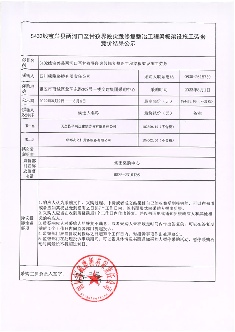 四川康藏路橋有限責(zé)任公司S432線寶興縣兩河口至甘孜界段災(zāi)毀修復(fù)整治工程梁板架設(shè)施工勞務(wù)競價結(jié)果公示