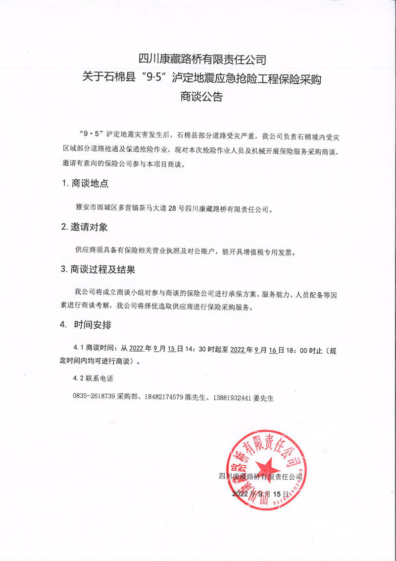 四川康藏路橋有限責(zé)任公司關(guān)于石棉縣“9·5”瀘定地震應(yīng)急搶險(xiǎn)工程保險(xiǎn)采購商談公告