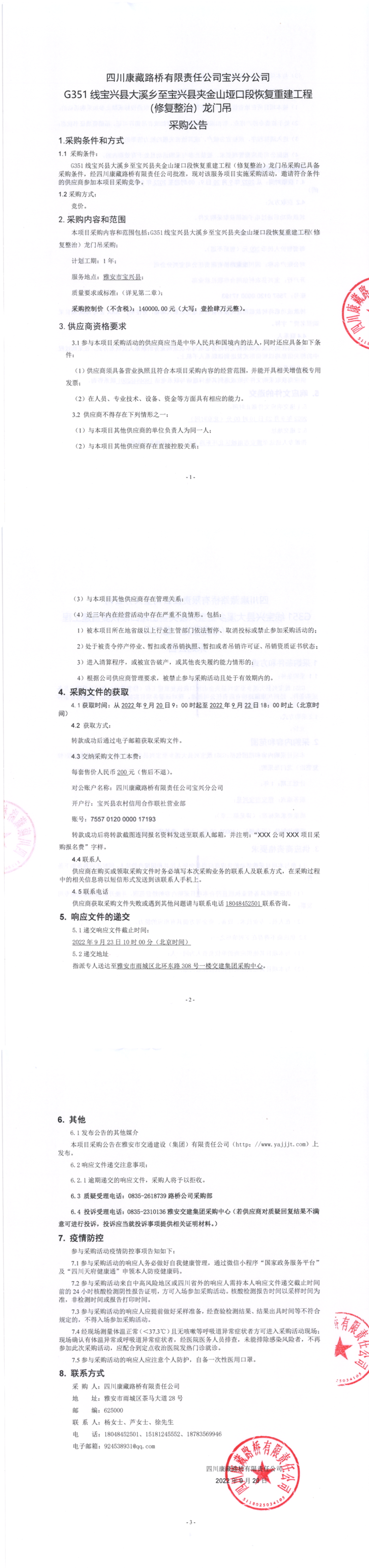 四川康藏路橋有限責(zé)任公司寶興分公司G351大溪鄉(xiāng)至寶興縣夾金山埡口段恢復(fù)重建工程(修復(fù)整治)龍門吊采購(gòu)公告