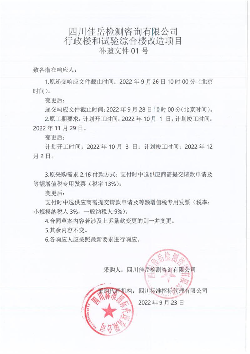 四川佳岳檢測(cè)咨詢(xún)有限公司行政樓和試驗(yàn)綜合樓改造項(xiàng)目補(bǔ)遺文件01號(hào)