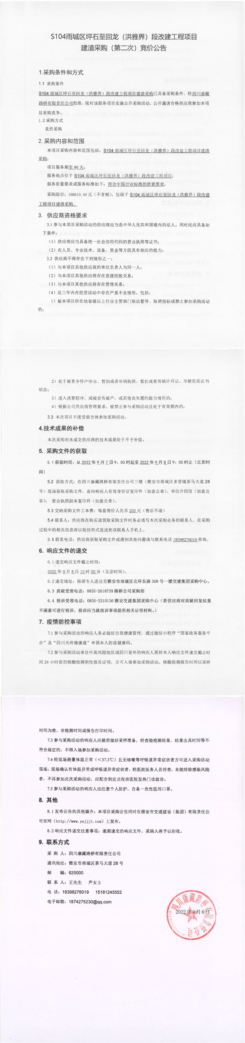 四川康藏路橋有限責(zé)任公司S104雨城區(qū)坪石至回龍(洪雅界)段改建工程項目建渣采購(第二次)競價公告