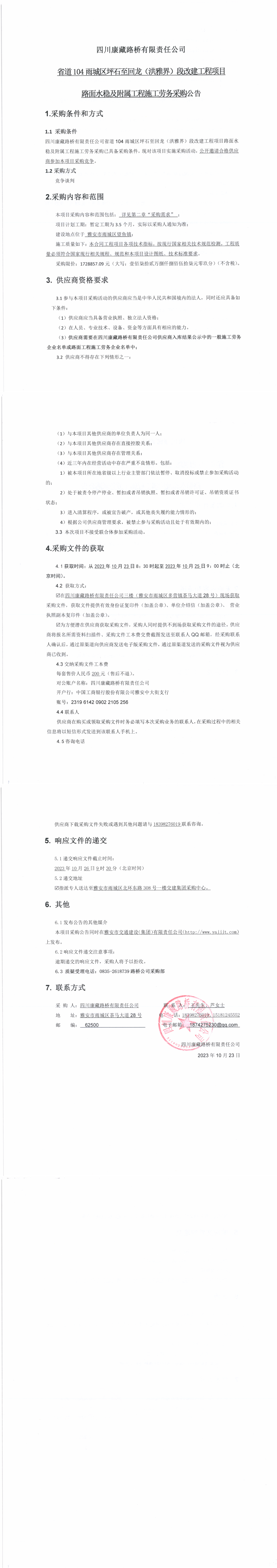 四川康藏路橋有限責任公司省道104雨城區(qū)坪石至回龍(洪雅界)段改建工程項目路面水穩(wěn)及附屬工程施工勞務(wù)采購公告