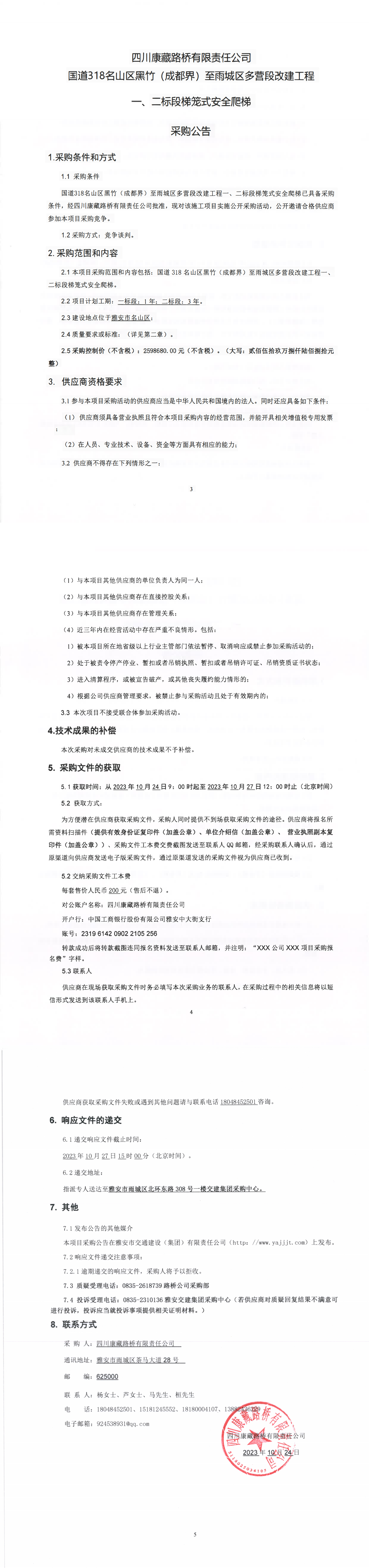 四川康藏路橋有限責(zé)任公司國道318名山區(qū)黑竹(成都界)至雨城區(qū)多營段改建工程一、二標段梯籠式安全爬梯采購公告