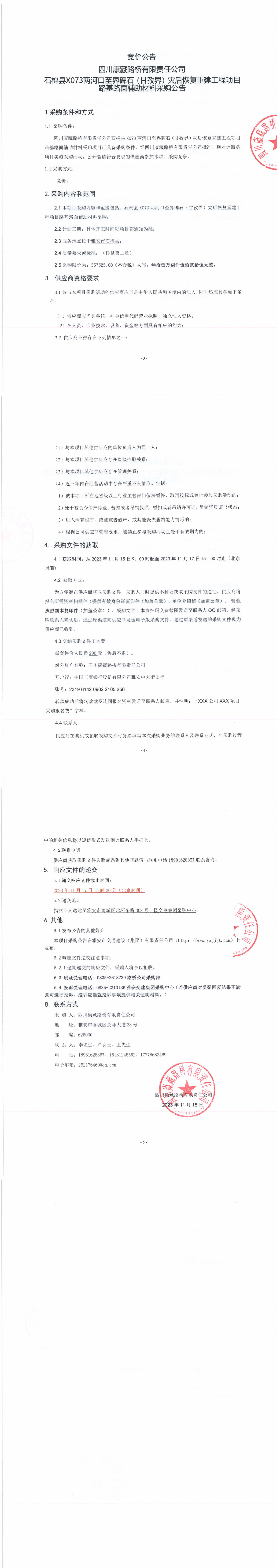 四川康藏路橋有限責(zé)任公司石棉縣X073兩河口至界碑石(甘孜界)災(zāi)后恢復(fù)重建工程項(xiàng)目路基路面輔助材料采購(gòu)公告