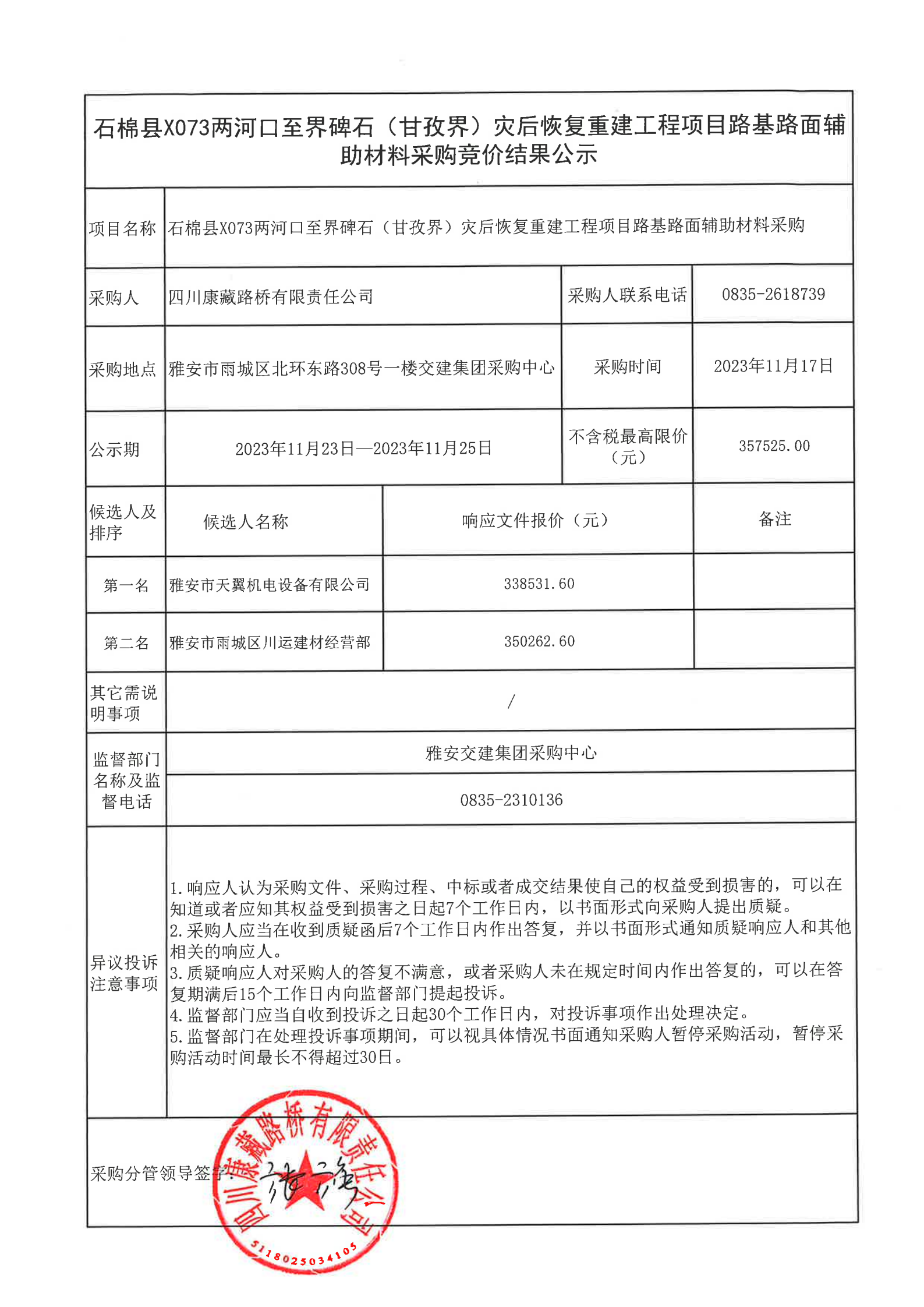 四川康藏路橋有限責任公司石棉縣X073兩河口至界碑石(甘孜界)災后恢復重建工程項目路基路面輔助材料采購結(jié)果公示