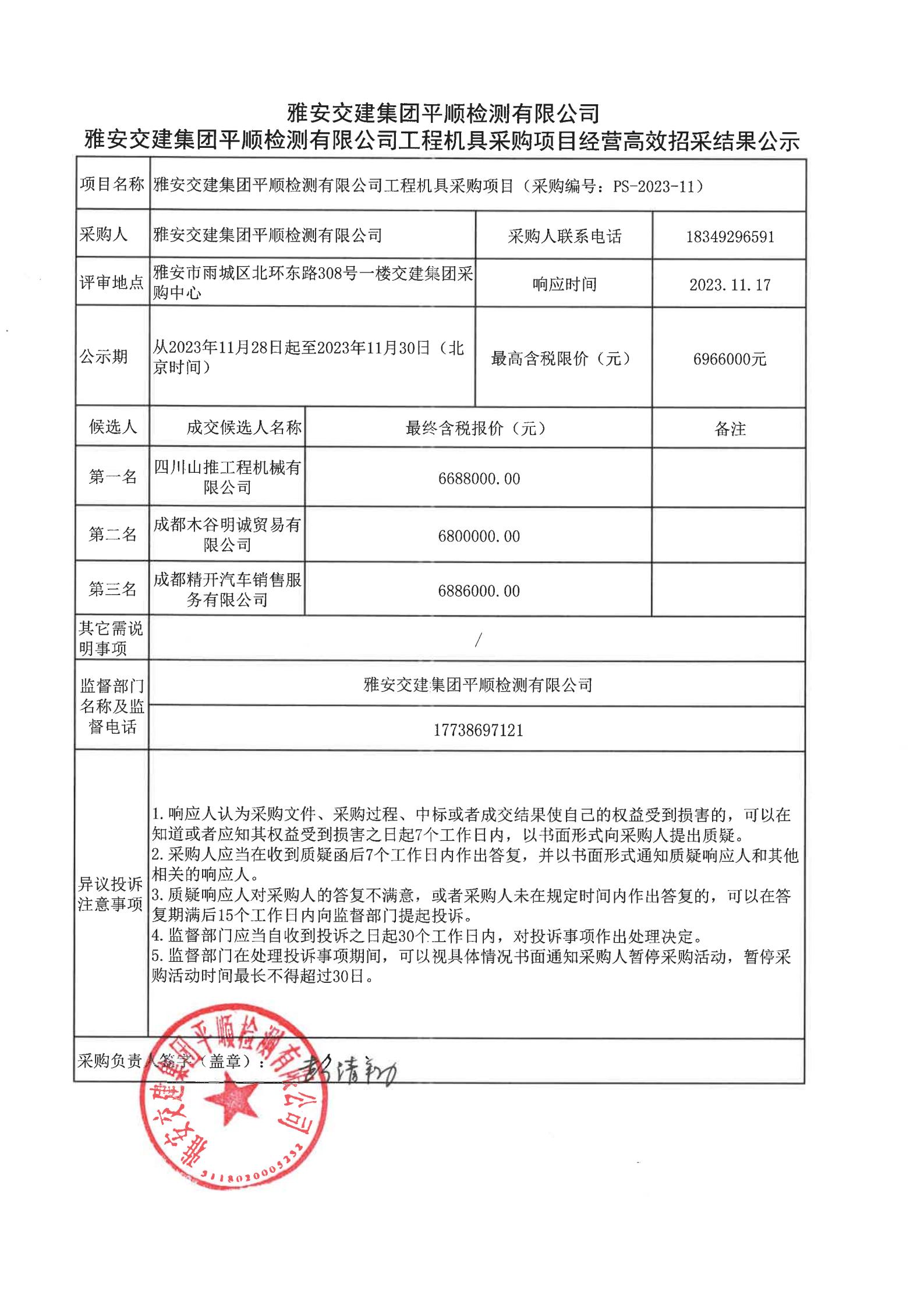 雅安交建集團(tuán)平順檢測(cè)有限公司工程機(jī)具采購(gòu)項(xiàng)目經(jīng)營(yíng)高效招采結(jié)果公示