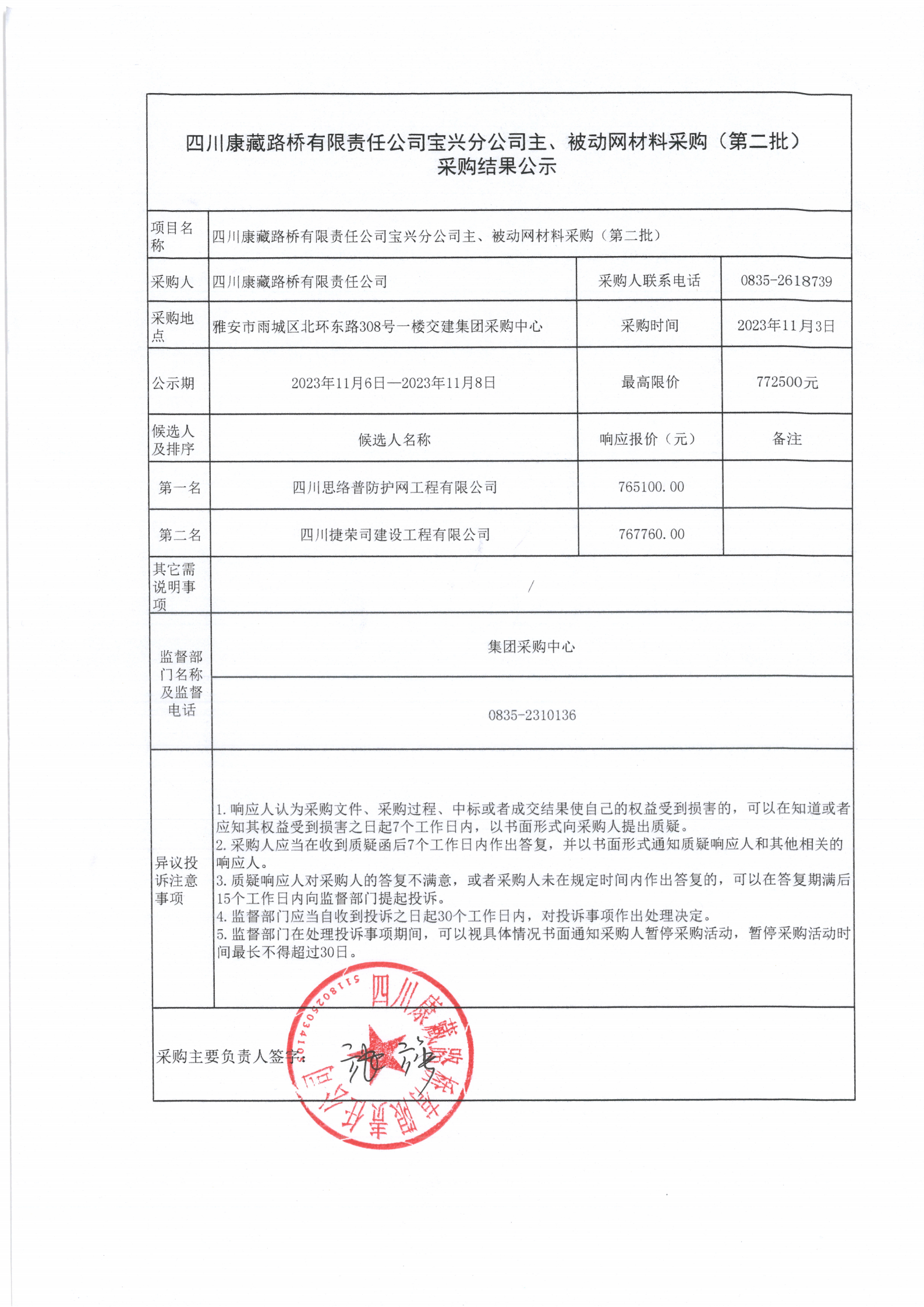 四川康藏路橋有限責(zé)任公司寶興分公司主、被動網(wǎng)材料采購(第二批)采購結(jié)果公示
