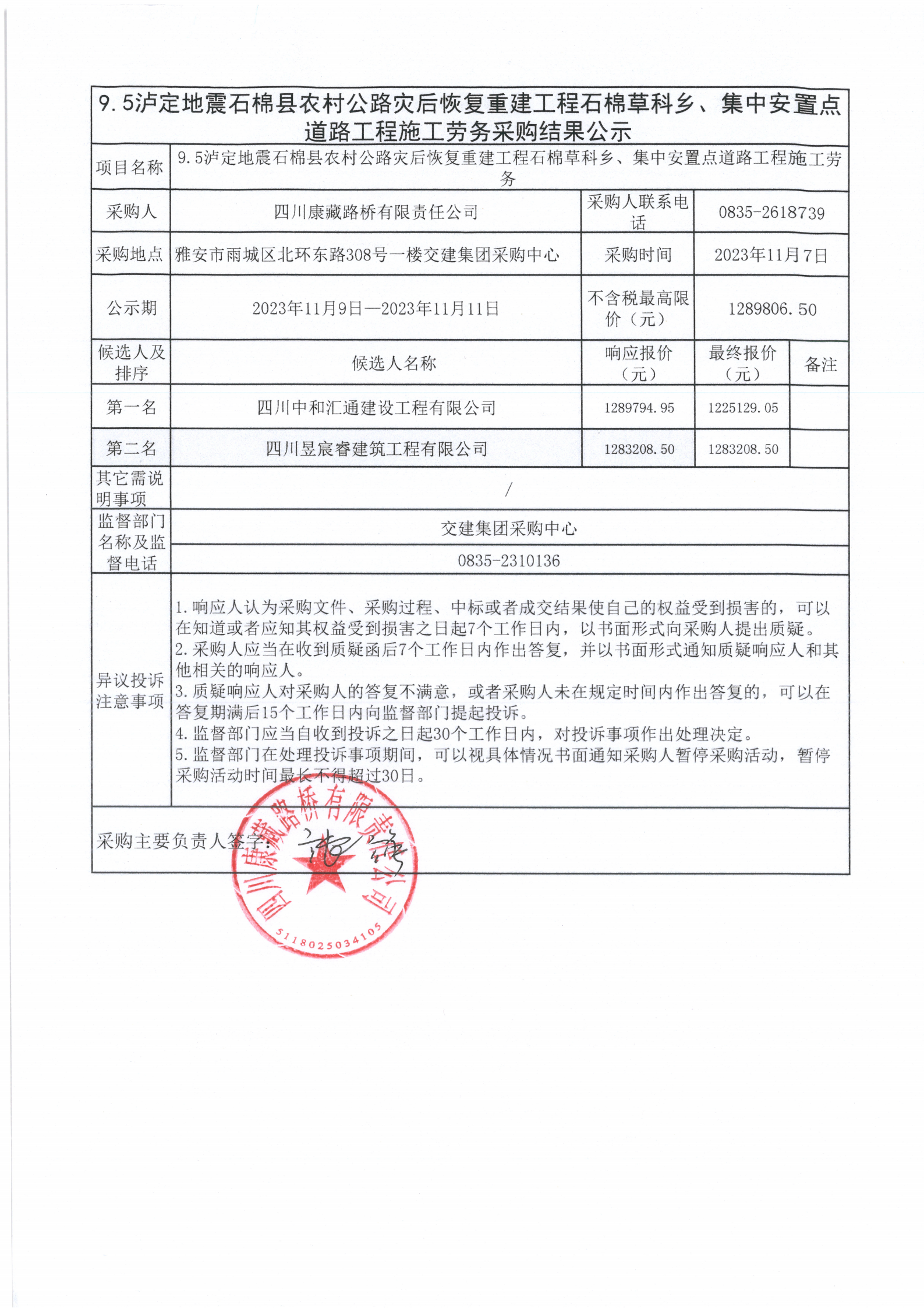 四川康藏路橋有限責(zé)任公司9.5瀘定地震石棉縣農(nóng)村公路災(zāi)后恢復(fù)重建工程石棉草科鄉(xiāng)、集中安置點道路工程施工勞務(wù)采購結(jié)果公示