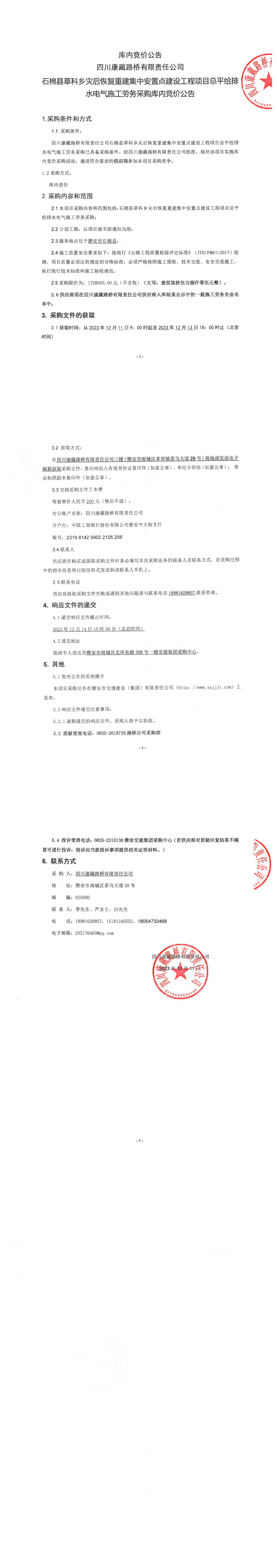 四川康藏路橋有限責(zé)任公司石棉縣草科鄉(xiāng)災(zāi)后恢復(fù)重建集中安置點(diǎn)建設(shè)工程項(xiàng)目總平給排水電氣施工勞務(wù)采購庫內(nèi)競價公告