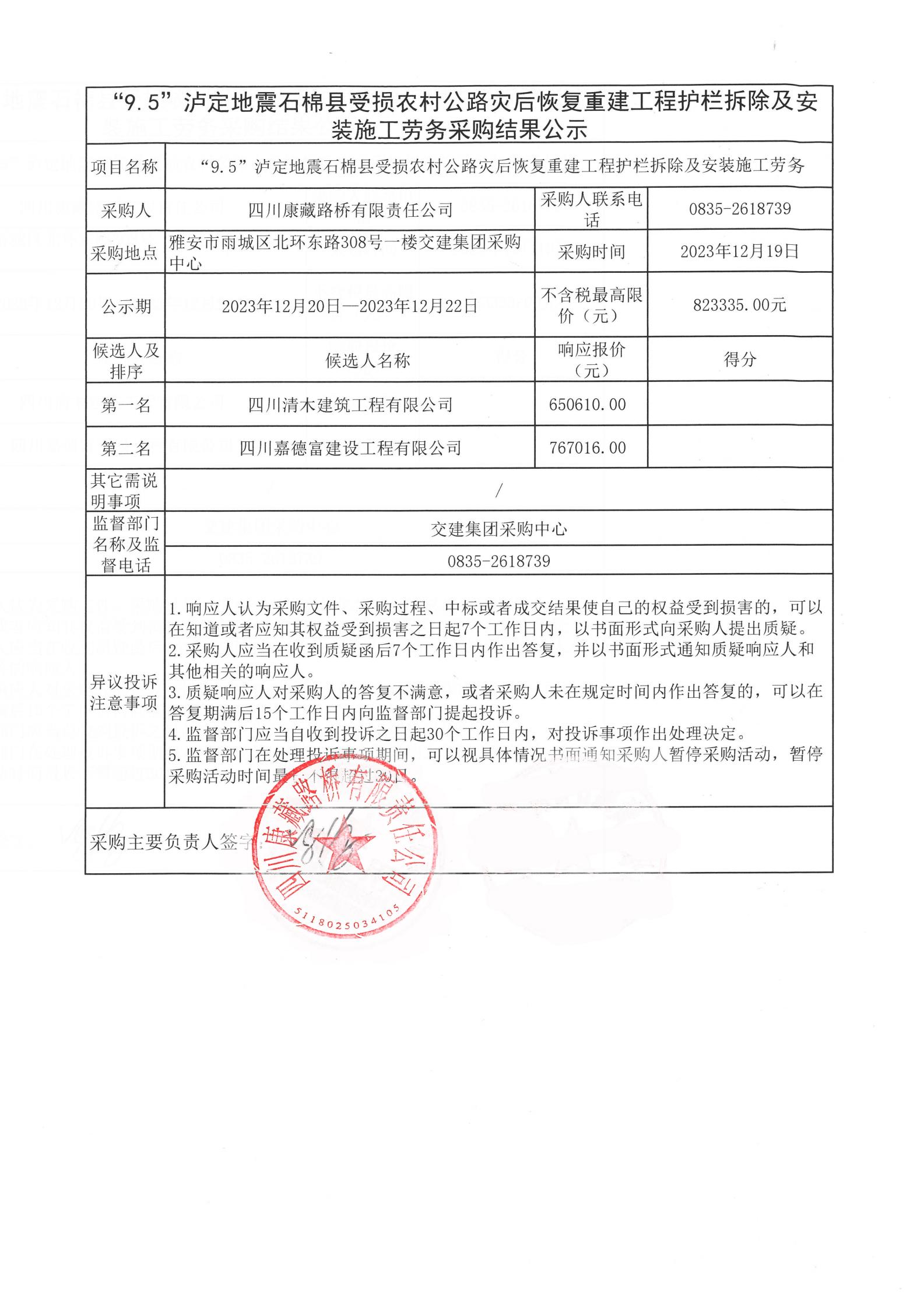 四川康藏路橋有限責(zé)任公司“9.5”瀘定地震石棉縣受損農(nóng)村公路災(zāi)后恢復(fù)重建工程護(hù)欄拆除及安裝施工勞務(wù)采購(gòu)結(jié)果公示