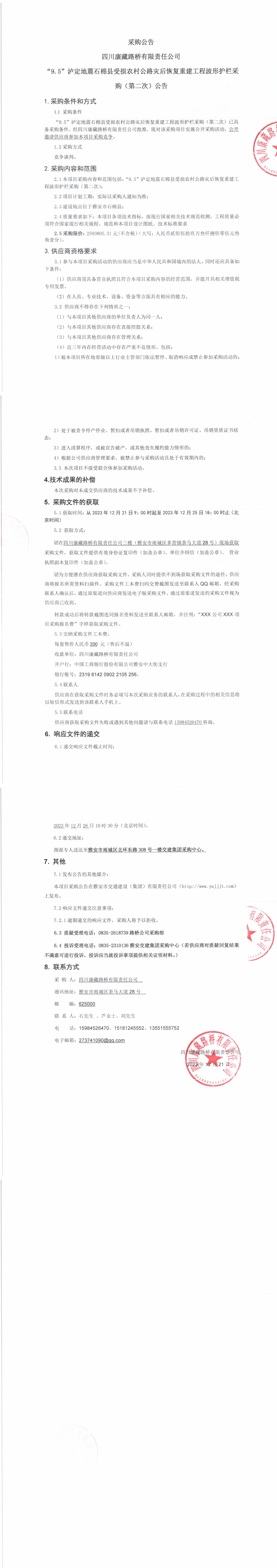 四川康藏路橋有限責任公司“9.5”瀘定地震石棉縣受損農(nóng)村公路災(zāi)后恢復(fù)重建工程波形護欄采購(第二次)公告