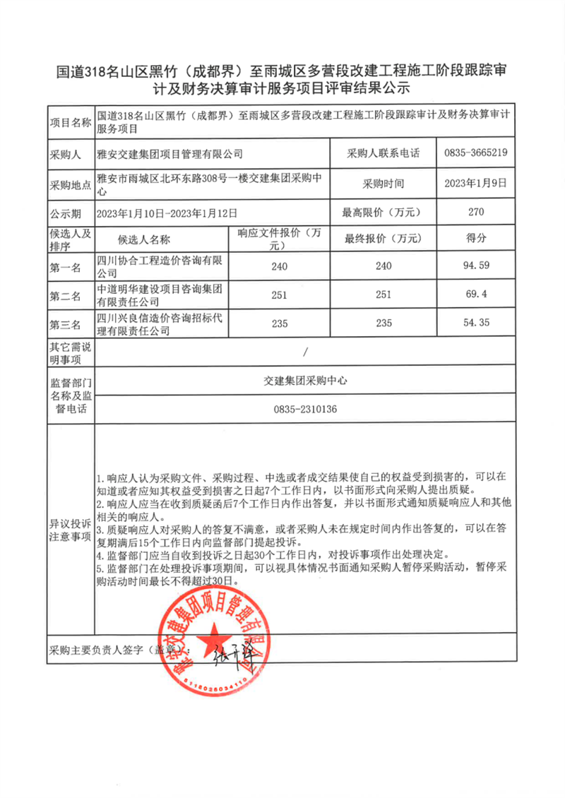 雅安交建集團項目管理有限公司國道318名山區(qū)黑竹(成都界)至雨城區(qū)多營段改建工程施工階段跟蹤審計及財務(wù)決算審計服務(wù)項目評審結(jié)果公示