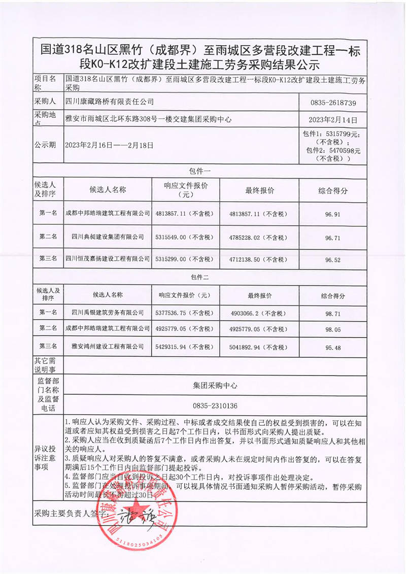 四川康藏路橋有限責任公司國道318名山區(qū)黑竹(成都界)至雨城區(qū)多營段改建工程一標段K0-K12改擴建段土建施工勞務(wù)采購結(jié)果公示