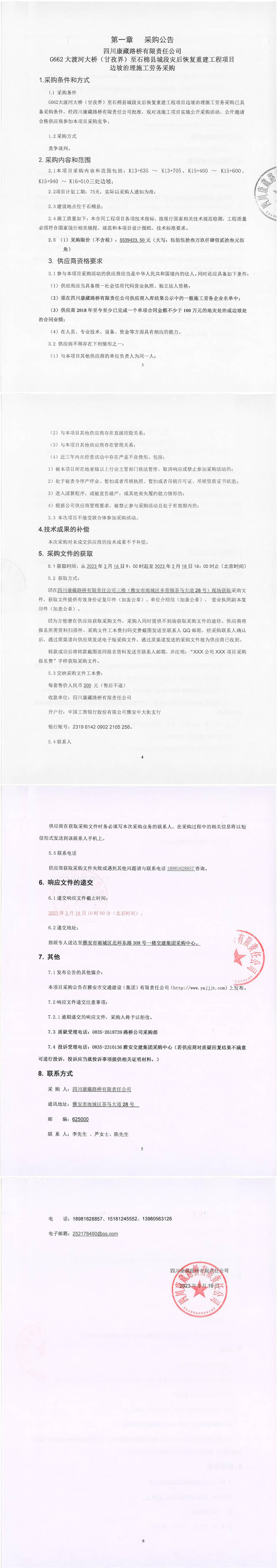 四川康藏路橋有限責(zé)任公司G662大渡河大橋(甘孜界)至石棉縣城段災(zāi)后恢復(fù)重建工程項(xiàng)目邊坡治理施工勞務(wù)采購公告