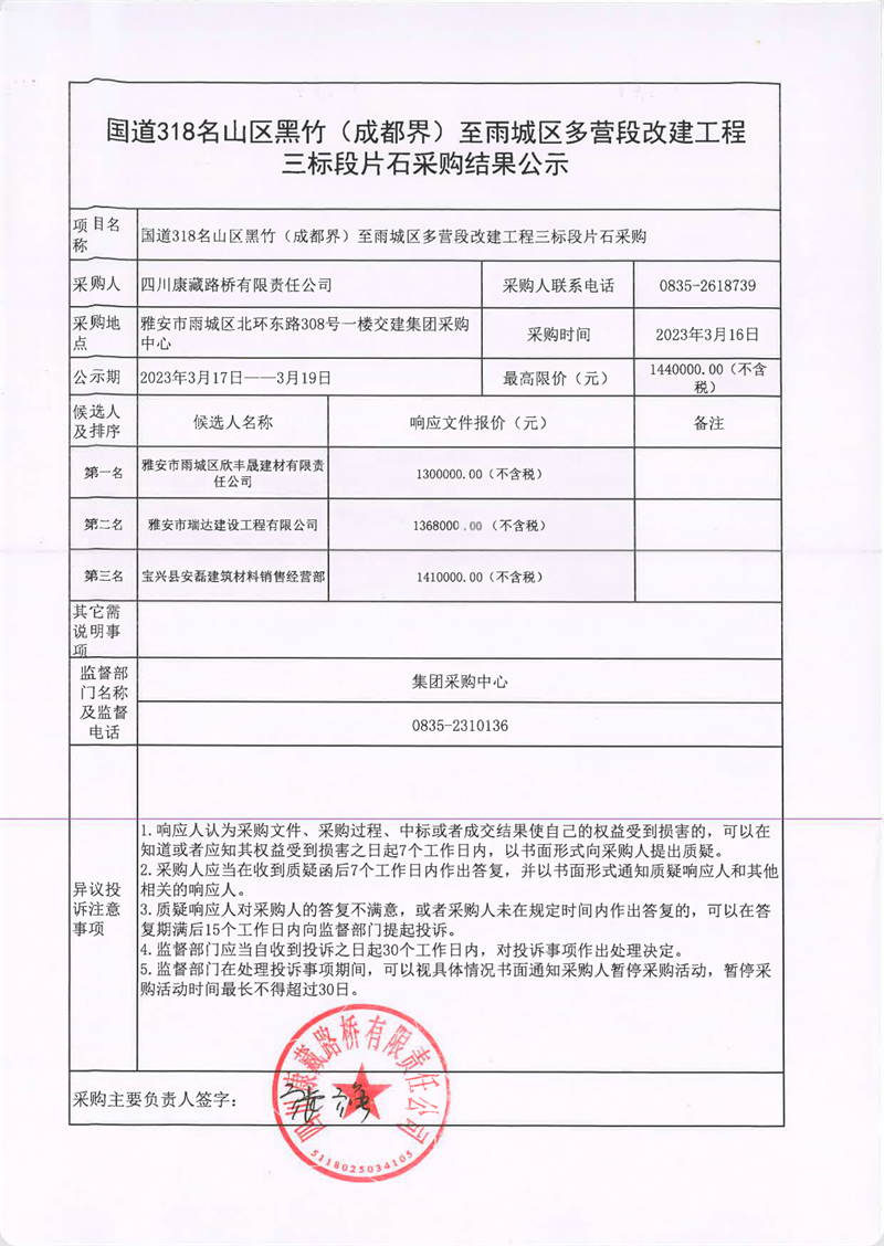 四川康藏路橋有限責任公司國道318名山區(qū)黑竹(成都界)至雨城區(qū)多營段改建工程三標段片石采購結(jié)果公示