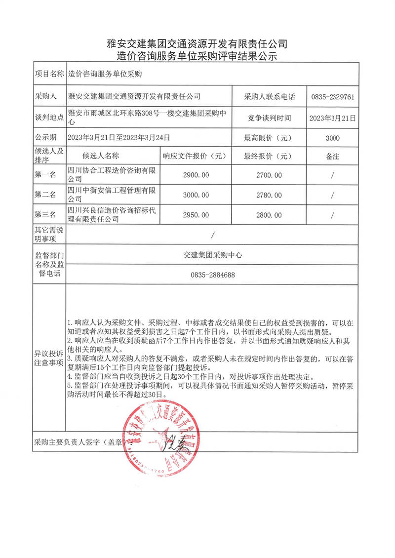 雅安交建集團交通資源開發(fā)有限責任公司造價咨詢服務(wù)單位采購評審結(jié)果公示