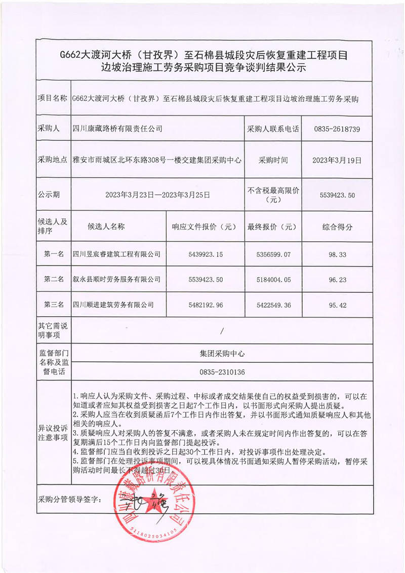 四川康藏路橋有限責任公司G662大渡河大橋(甘孜界)至石棉縣城段災后恢復重建工程項目邊坡治理施工勞務采購項目競爭談判結果公示