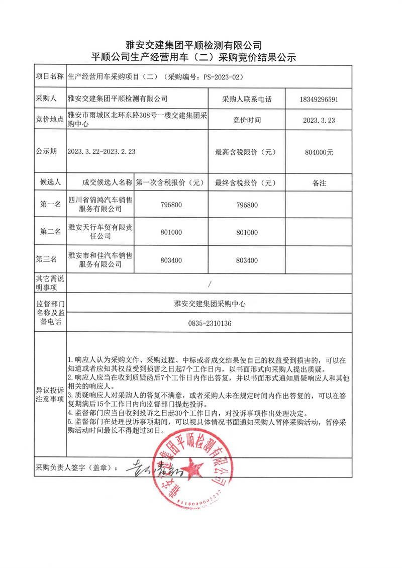 雅安交建集團(tuán)平順檢測有限公司平順公司生產(chǎn)經(jīng)營用車(二)采購競價結(jié)果公示
