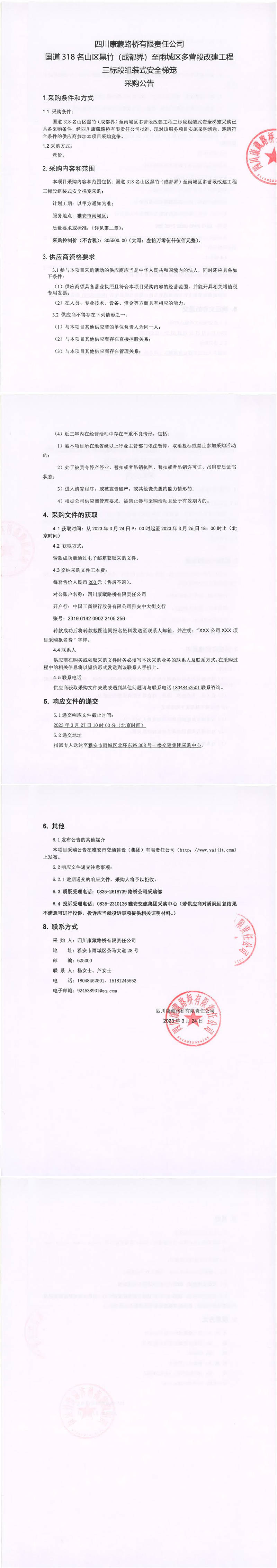 四川康藏路橋有限責任公司國道318名山區(qū)黑竹(成都界)至雨城區(qū)多營段改建工程三標段組裝式安全梯籠采購公告
