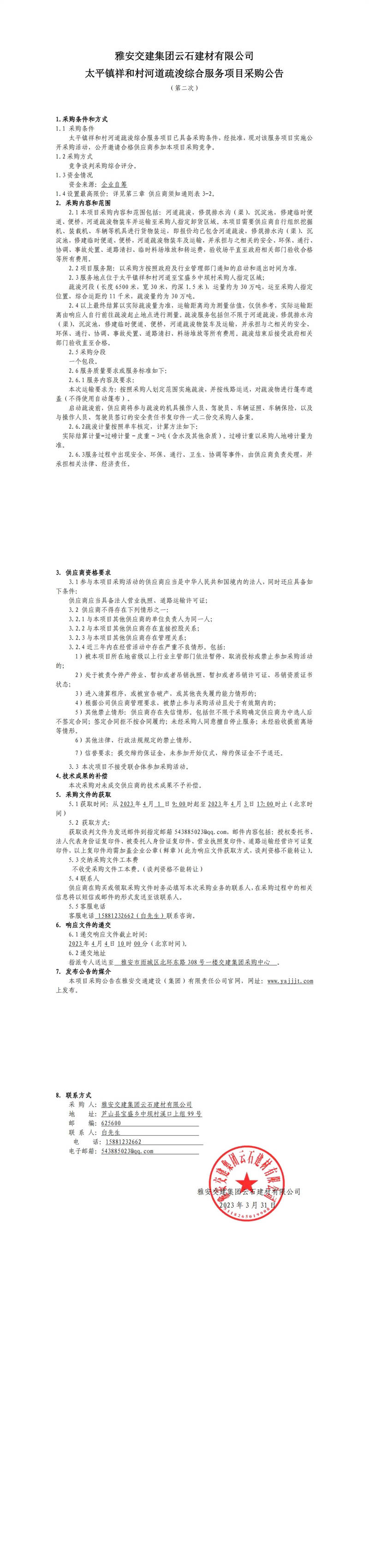 雅安交建集團云石建材有限公司太平鎮(zhèn)祥和村河道疏浚綜合服務項目采購公告(第二次)