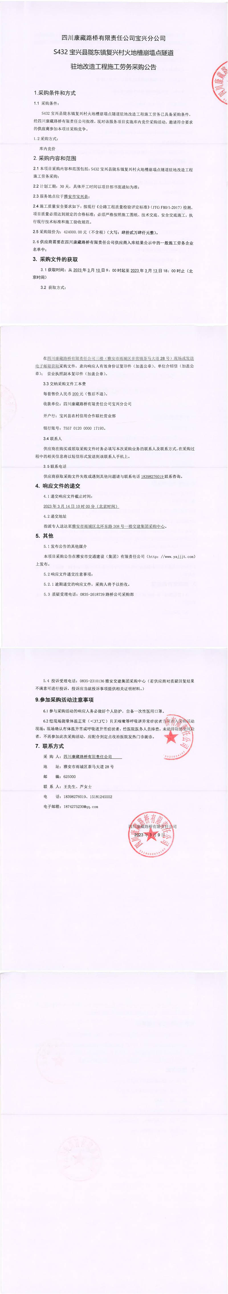 四川康藏路橋有限責任公司寶興分公司S432寶興縣隴東鎮(zhèn)復興村火地槽崩塌點隧道駐地改造工程施工勞務采購公告
