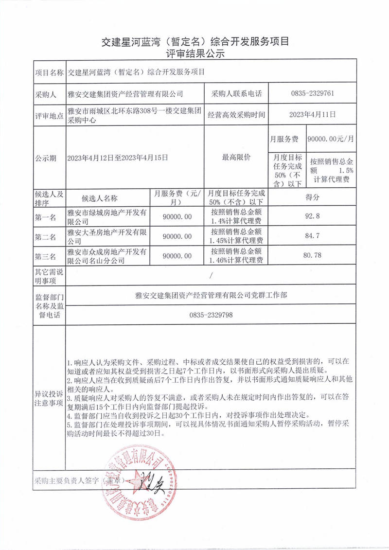 雅安交建集團(tuán)資產(chǎn)經(jīng)營管理有限公司交建星河藍(lán)灣(暫定名)綜合開發(fā)服務(wù)項目評審結(jié)果公示