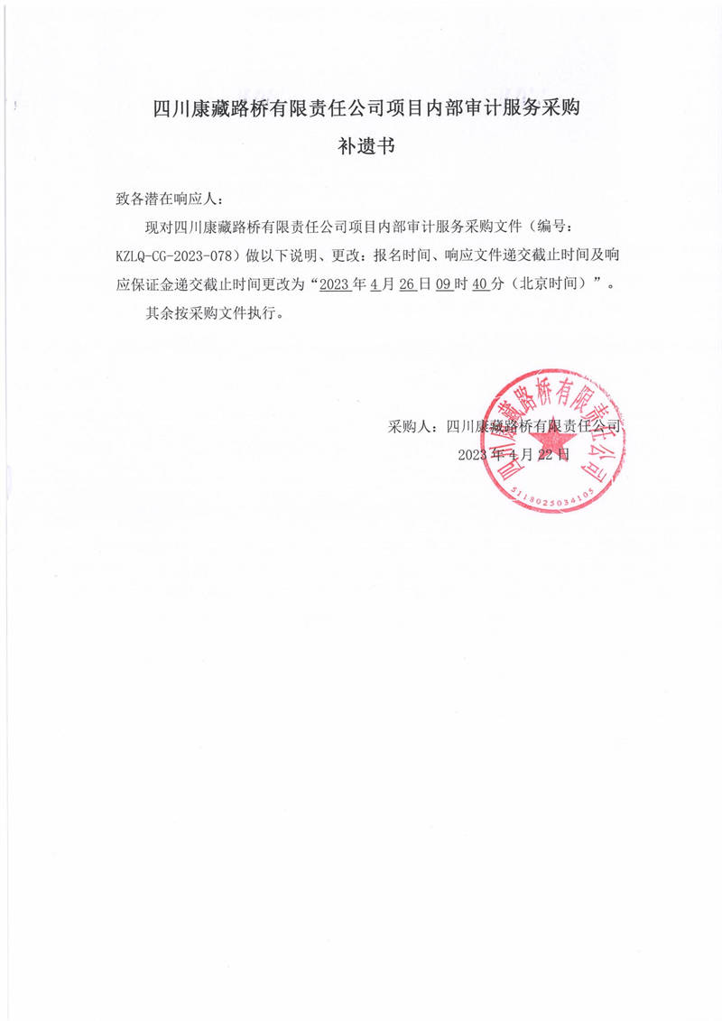 四川康藏路橋有限責(zé)任公司項目內(nèi)部審計服務(wù)采購補遺書