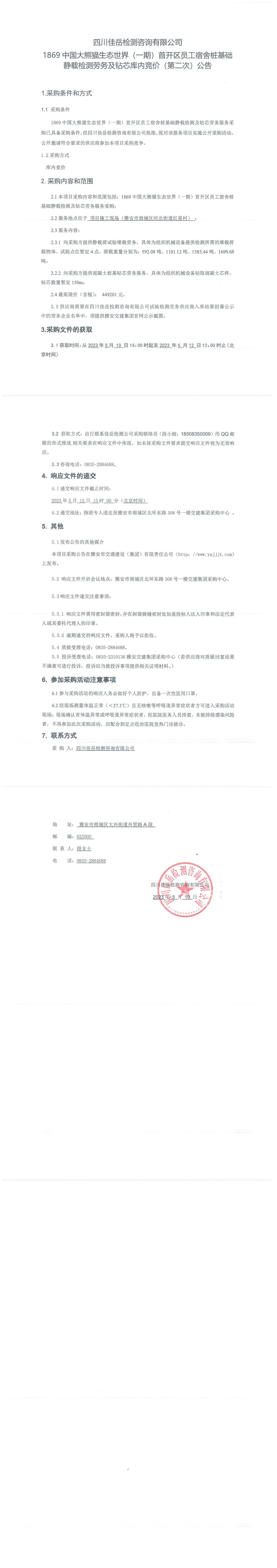 四川佳岳檢測(cè)咨詢有限公司1869中國(guó)大熊貓生態(tài)世界(一期)首開(kāi)區(qū)員工宿舍樁基礎(chǔ)靜載檢測(cè)勞務(wù)及磚芯庫(kù)內(nèi)競(jìng)價(jià)(第二次)采購(gòu)公告