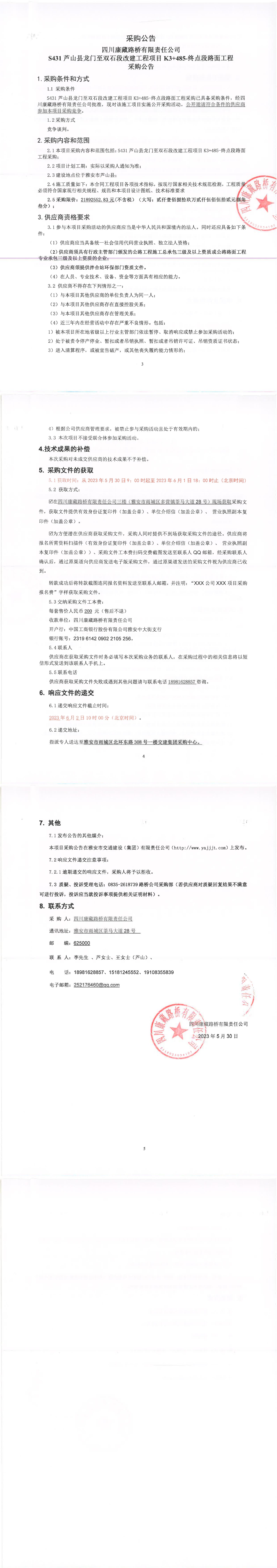 四川康藏路橋有限責(zé)任公司S431蘆山縣龍門至雙石段改建工程項(xiàng)目K3+485-終點(diǎn)段路面工程采購公告