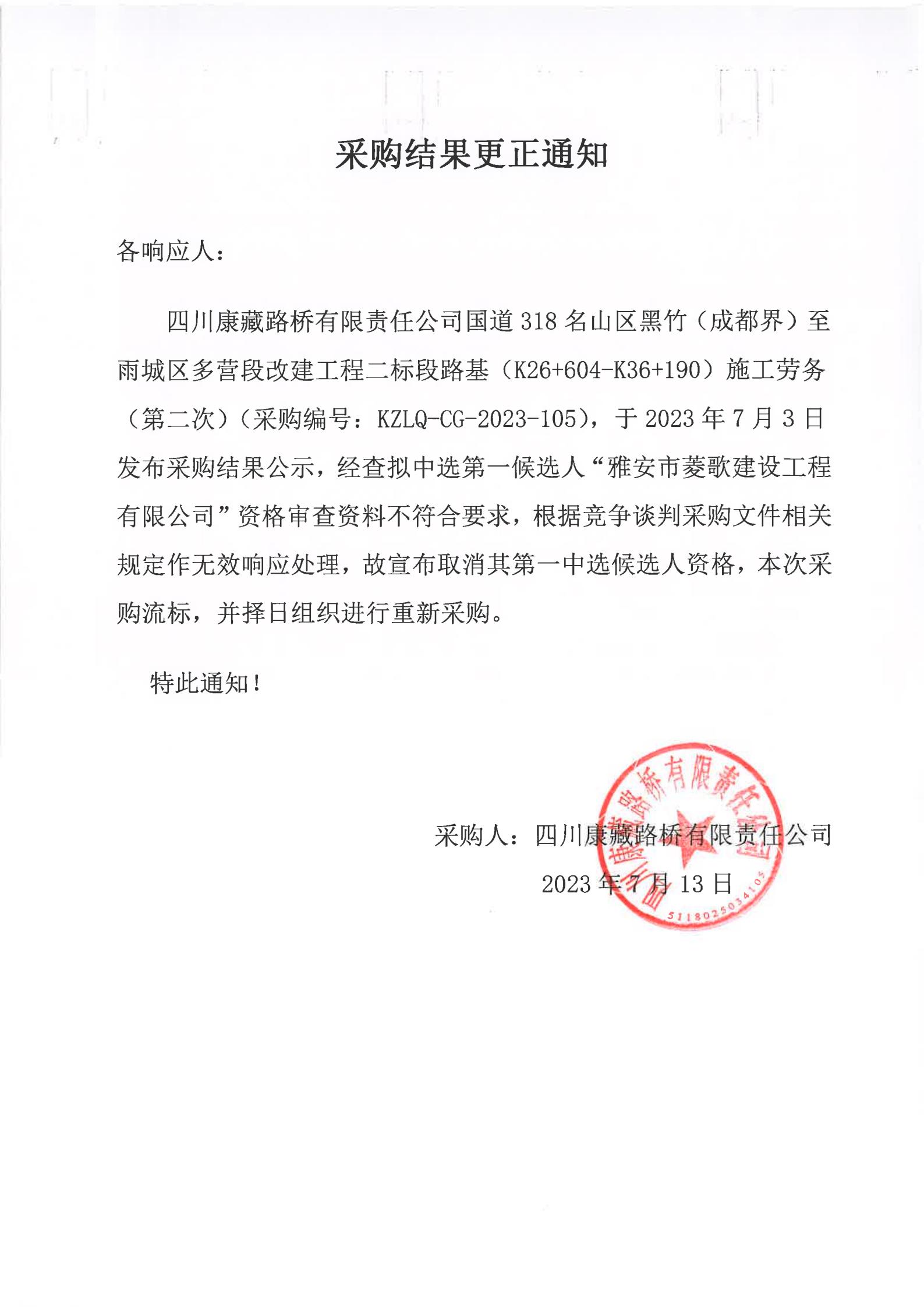 四川康藏路橋有限責(zé)任公司國(guó)道318名山區(qū)黑竹(成都界)至雨城區(qū)多營(yíng)段改建工程二標(biāo)段路基(K26+604-K36+190)施工勞務(wù)(第二次)采購(gòu)結(jié)果更正通知
