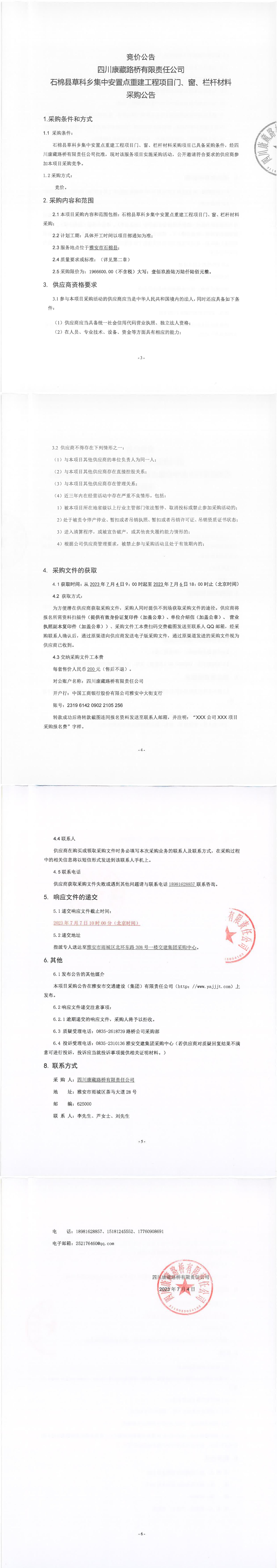 四川康藏路橋有限責任公司石棉縣草科鄉(xiāng)集中安置點重建工程項目門、窗、欄桿材料采購公告
