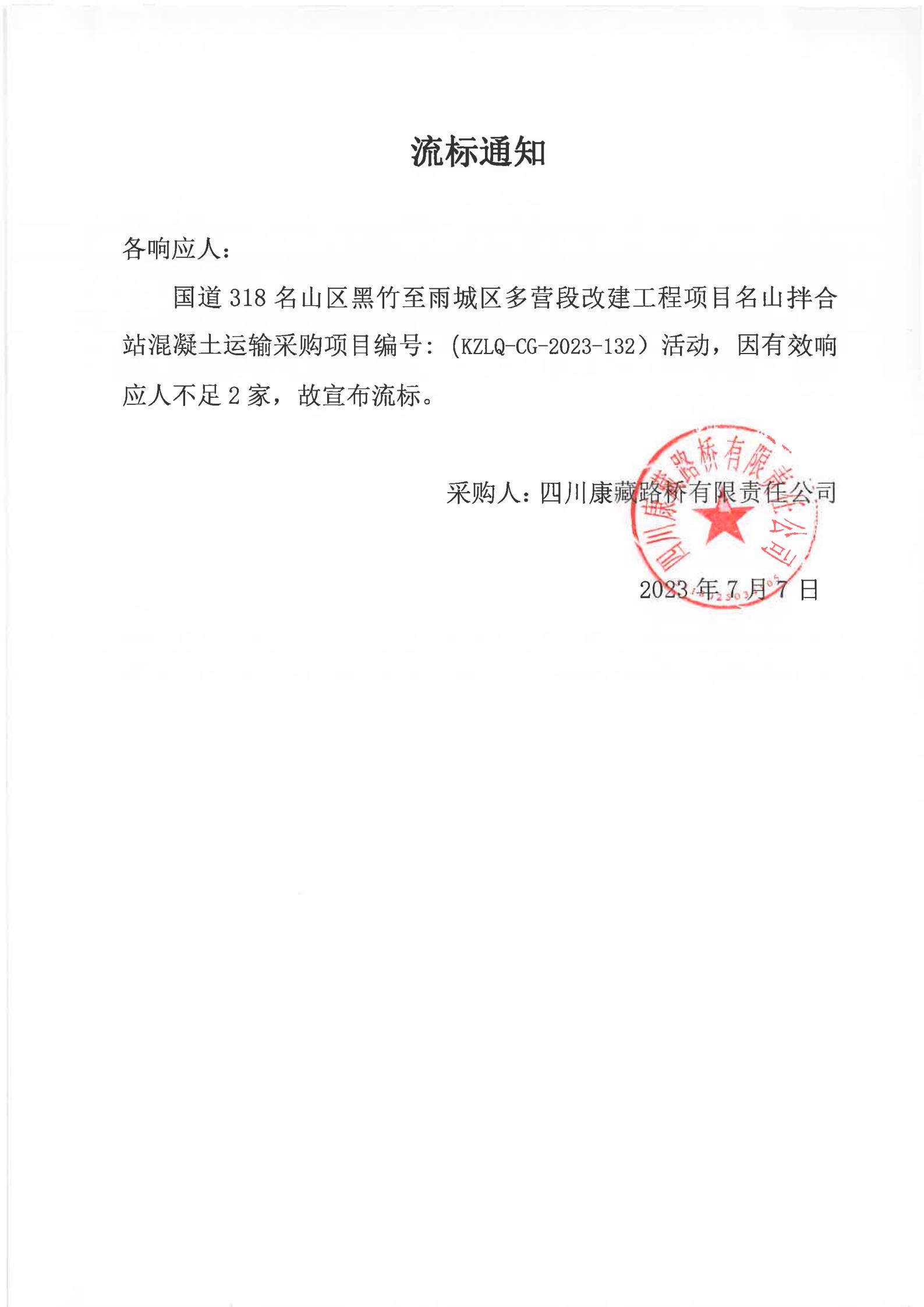四川康藏路橋有限責任公司國道318名山區(qū)黑竹(成都界)至雨城區(qū)多營段改建工程項目名山拌合站混凝土運輸采購流標通知