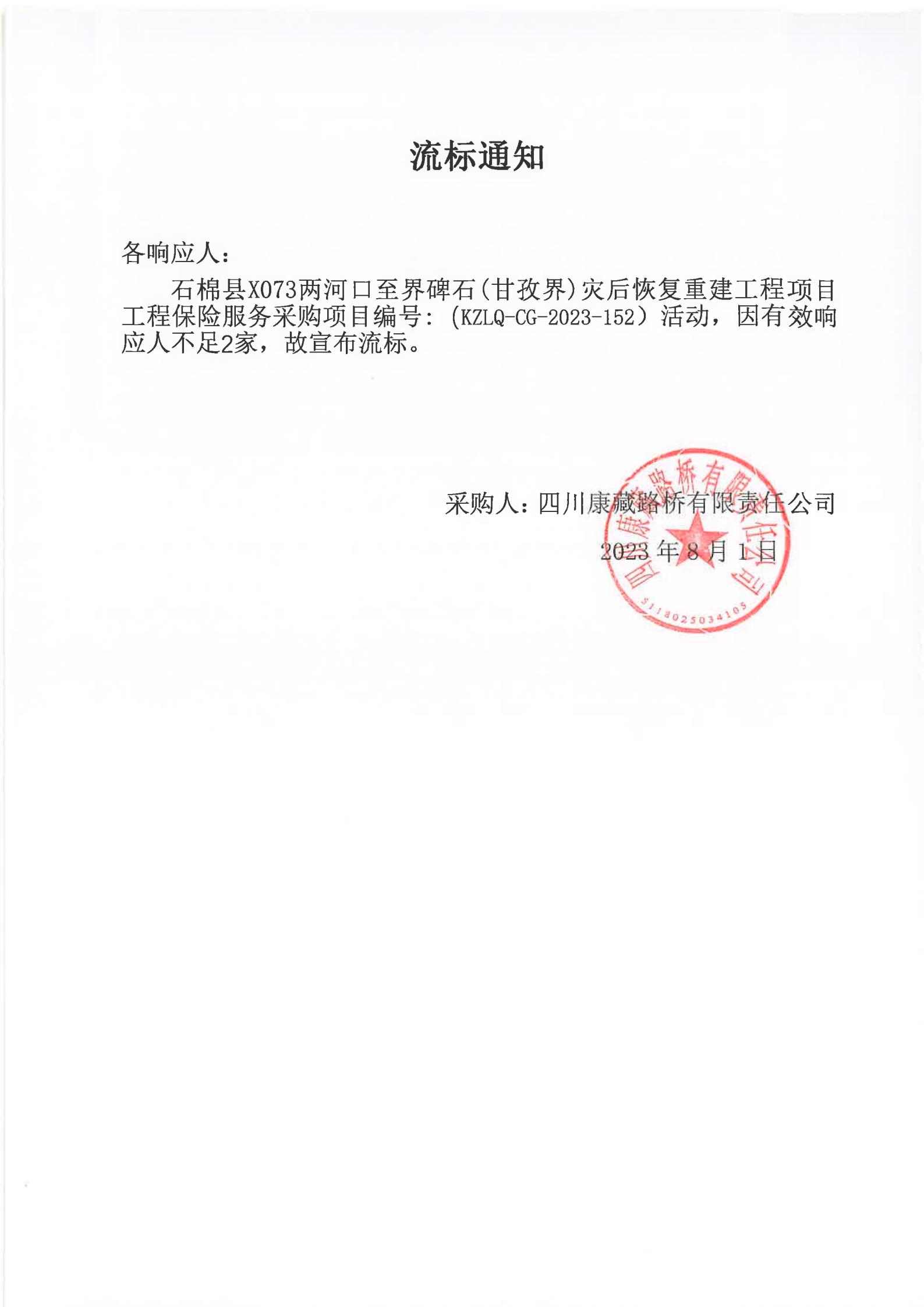 四川康藏路橋有限責(zé)任公司石棉分公司石棉縣X073兩河口至界碑石(甘孜界)災(zāi)后恢復(fù)重建工程項目工程保險服務(wù)采購項目流標(biāo)通知