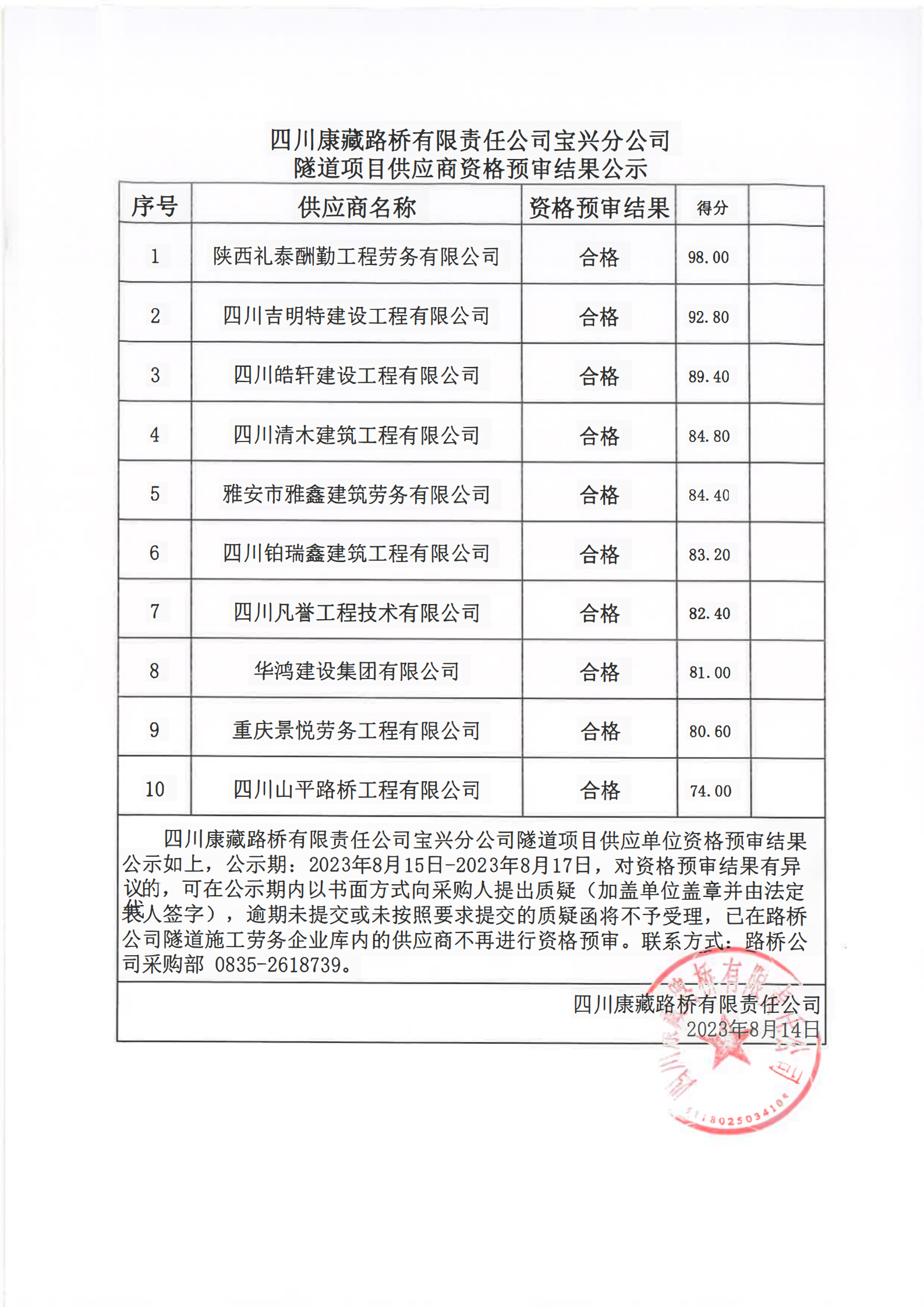 四川康藏路橋有限責(zé)任公司寶興分公司隧道項(xiàng)目供應(yīng)商資格預(yù)審結(jié)果公示