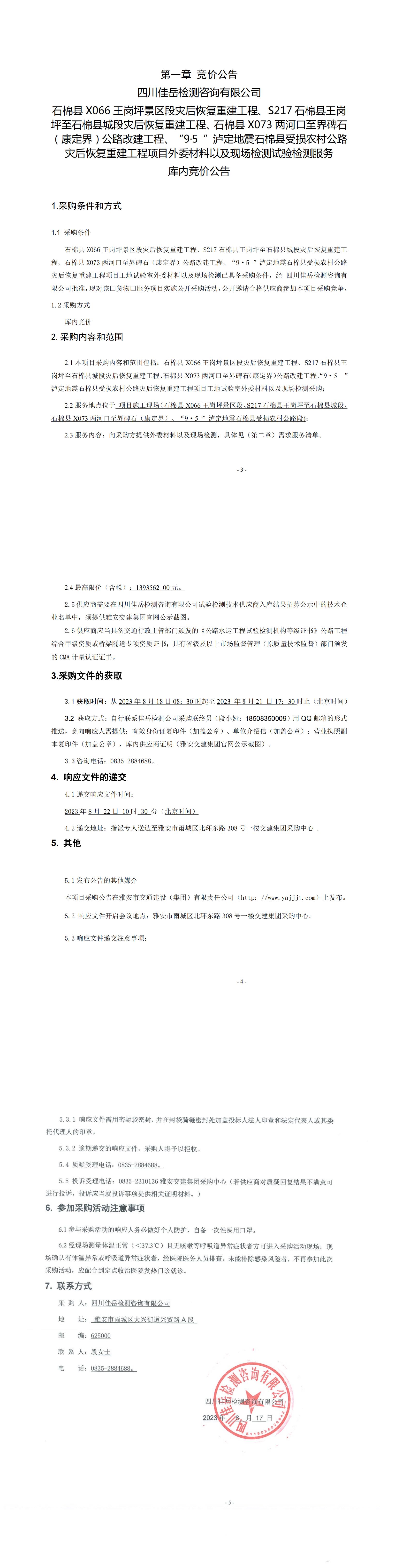 四川佳岳檢測咨詢有限公司石棉縣X066王崗坪至王崗坪景區(qū)段災(zāi)后恢復(fù)重建工程、S217石棉縣王崗坪至石棉縣城段災(zāi)后恢復(fù)重建工程、石棉縣X073兩河口至界碑石(康定界)公路改建工程、“9·5”瀘定地震石棉縣受損農(nóng)村公路災(zāi)后恢復(fù)重建工程項目外委材料以及現(xiàn)場檢測試驗檢測服務(wù)庫內(nèi)競價公告