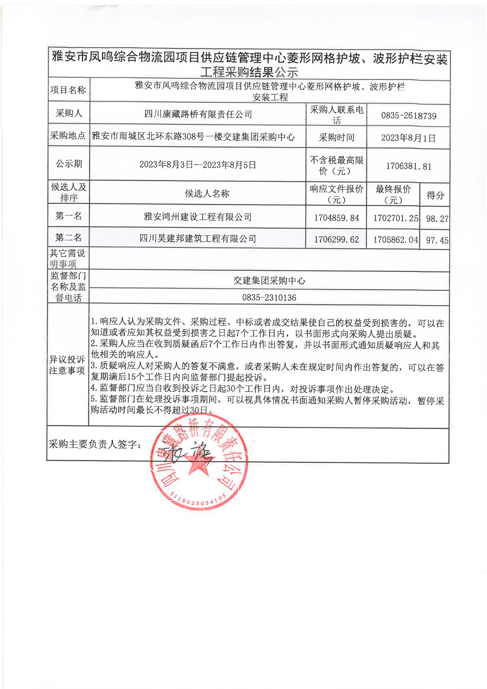 四川康藏路橋有限責任公司雅安市鳳鳴綜合物流園項目供應鏈管理中心菱形網(wǎng)格護坡、波形護欄安裝工程采購結果公示