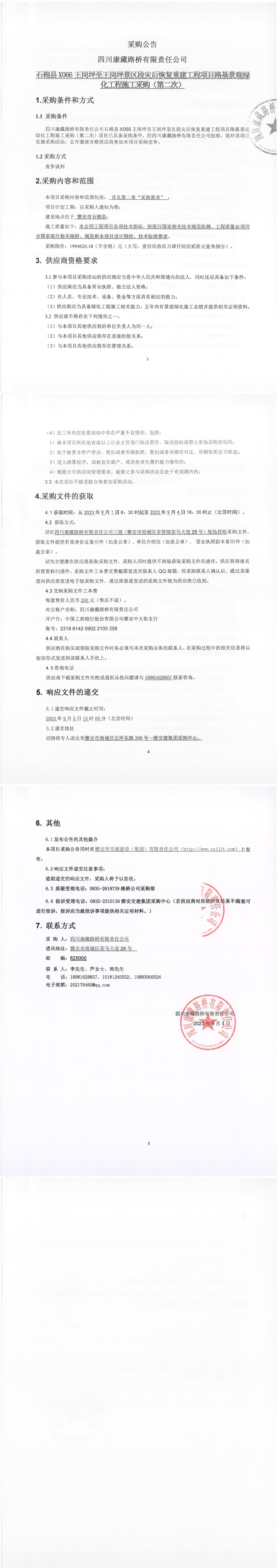 四川康藏路橋有限責任公司石棉縣X066王崗坪至王崗坪景區(qū)段災后恢復重建工程項目路基景觀綠化工程施工采購(第二次)