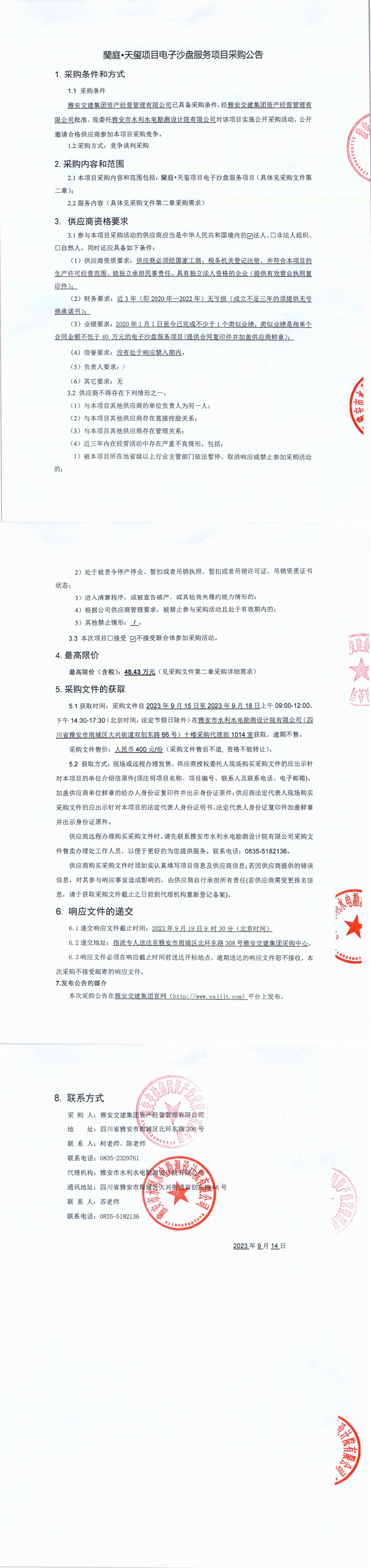 雅安交建集團資產(chǎn)經(jīng)營管理有限公司交建蘭庭·天璽項目電子沙盤服務項目競爭談判公告