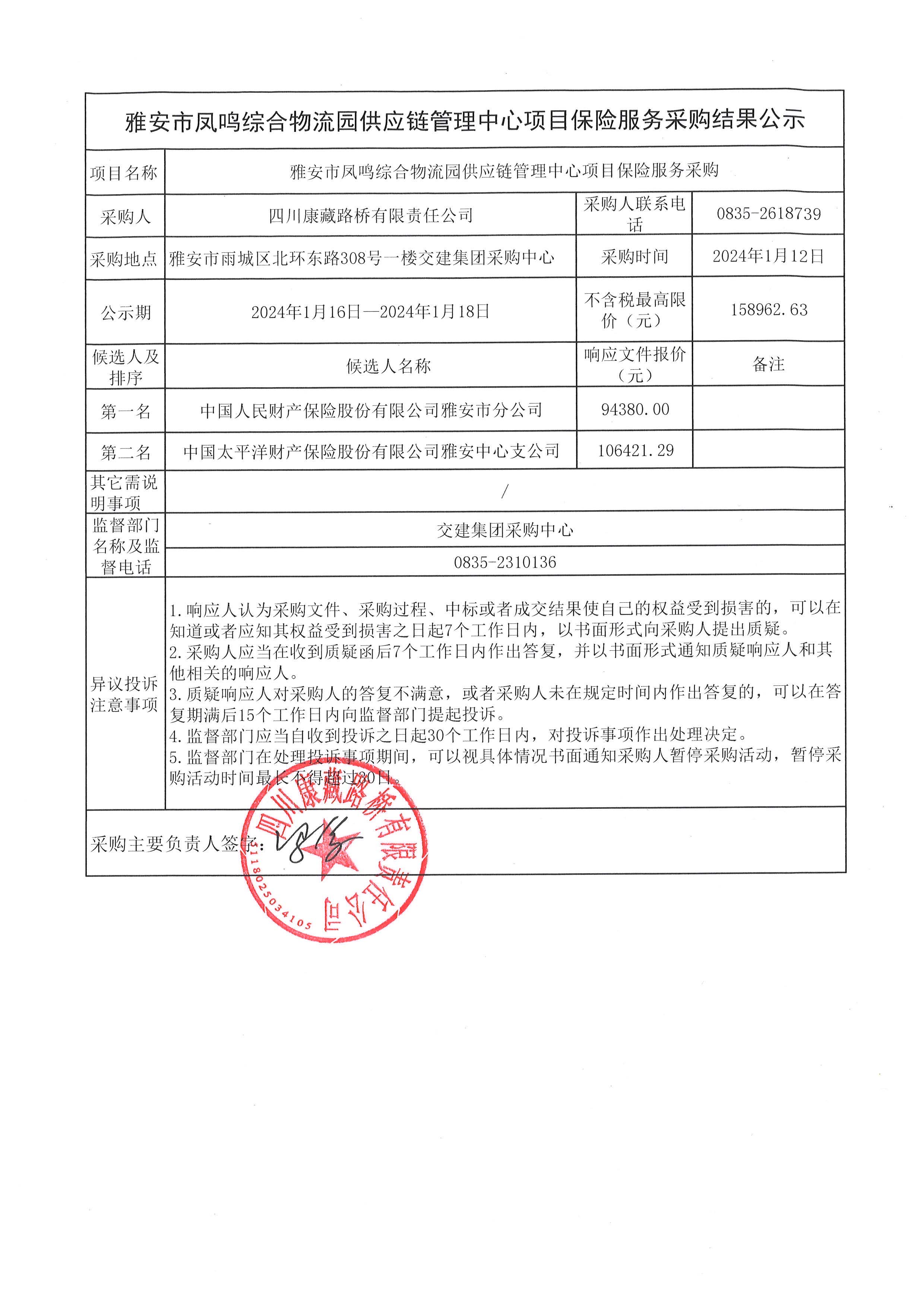 四川康藏路橋有限責任公司雅安市鳳鳴綜合物流園供應鏈管理中心項目保險服務采購結果公示