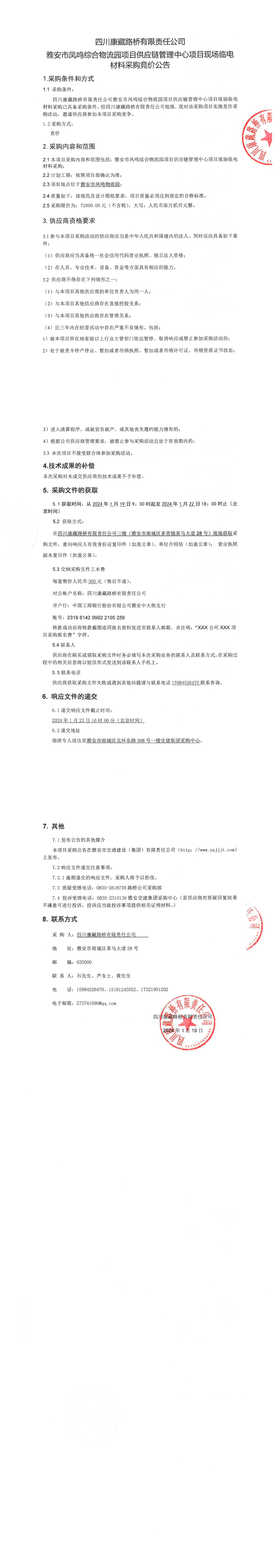四川康藏路橋有限責(zé)任公司雅安市鳳鳴綜合物流園項(xiàng)目供應(yīng)鏈管理中心項(xiàng)目現(xiàn)場臨電材料采購競價公告