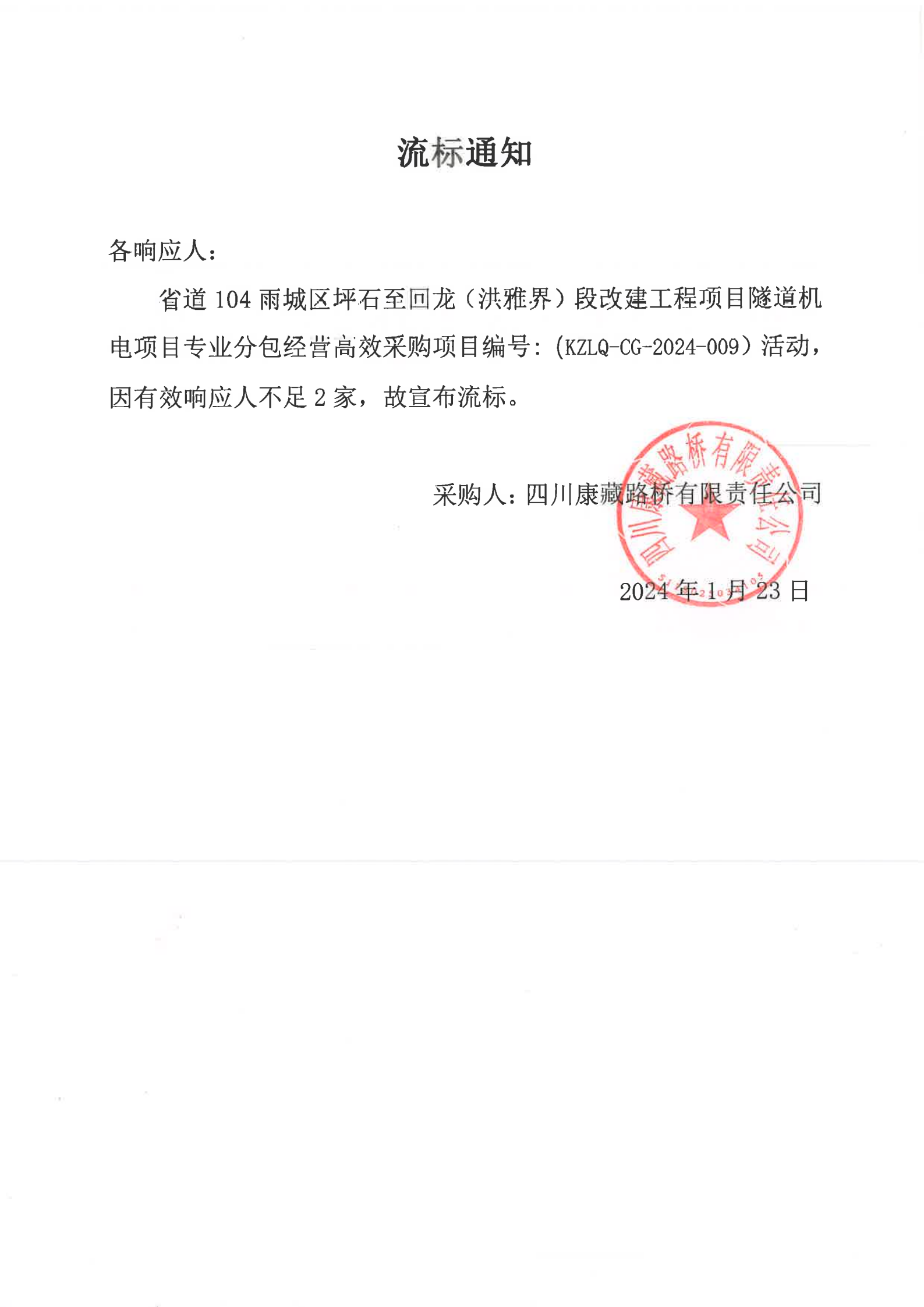 四川康藏路橋有限責(zé)任公司省道104雨城區(qū)坪石至回龍(洪雅界)段改建工程項(xiàng)目隧道機(jī)電項(xiàng)目專業(yè)分包經(jīng)營(yíng)高效采購(gòu)流標(biāo)通知