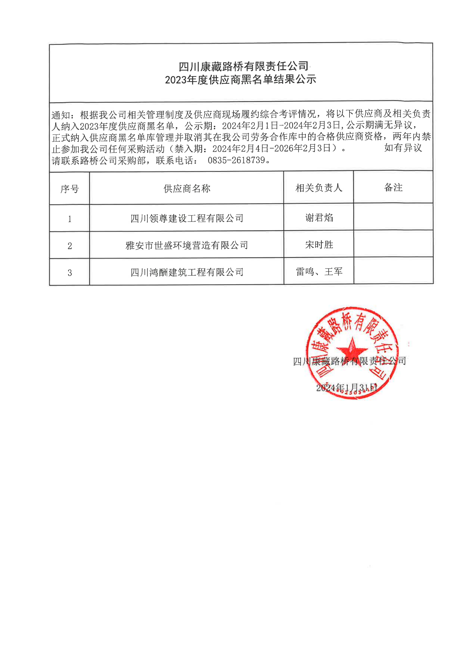 四川康藏路橋有限責(zé)任公司2023年度供應(yīng)商黑名單結(jié)果公示