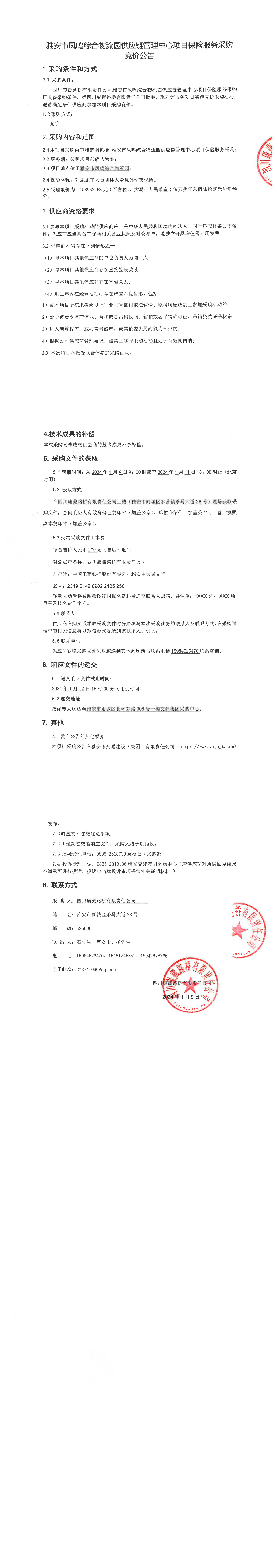四川康藏路橋有限責任公司雅安鳳鳴綜合物流園供應鏈管理中心項目保險服務(wù)采購競價公告