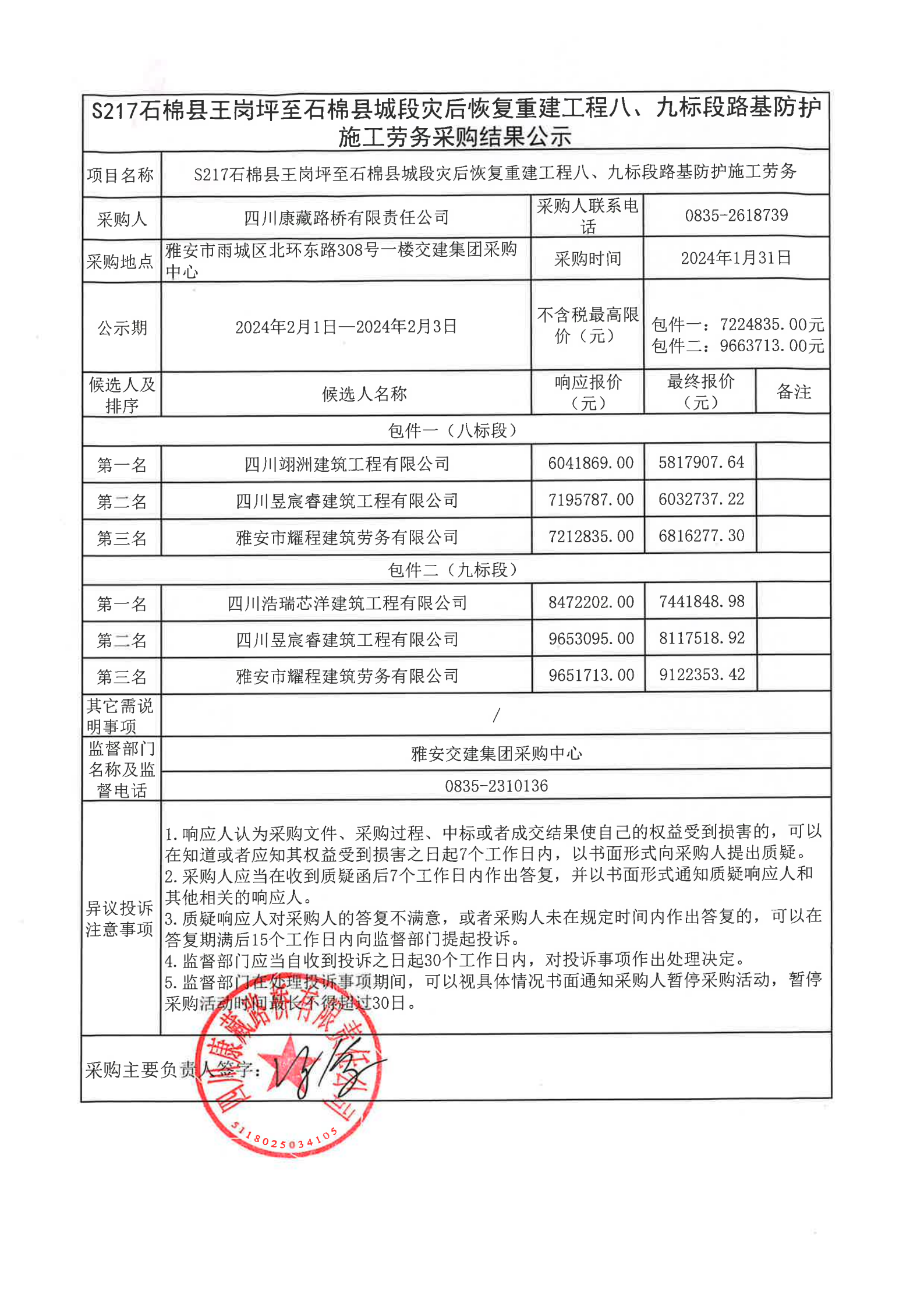四川康藏路橋有限責(zé)任公司S217石棉縣王崗坪至石棉縣城段災(zāi)后恢復(fù)重建工程八、九標(biāo)段路基防護施工勞務(wù)采購結(jié)果公示